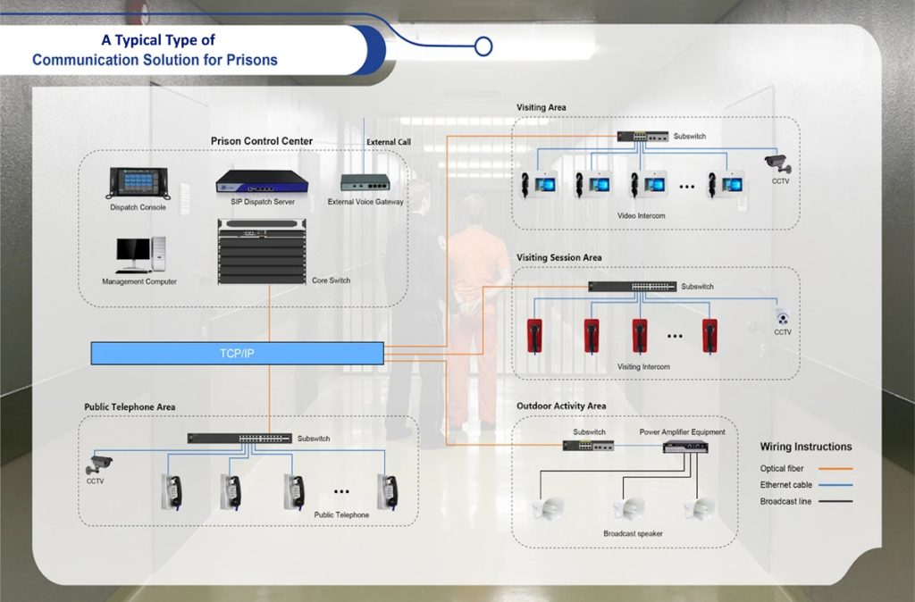 Due to the particularity of the industry, the prison system has formed a relatively independent group. In order to ensure the normal progress of work and emergency response to emergencies, the prison system has special and strict requirements on communication tools, and the construction of prison communications requirement need to be further strengthened not only in the digital information sense but also in the physical sense. While it is convenient for inmates to communicate with their relatives, it greatly reduces the work pressure and burden of prison guards, accurately and real-time monitors the ideological status of inmates during the reform process, and greatly improves the level of supervision.